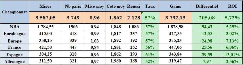 Pour interpréter les résultats, si votre unité de mise est par exemple de 100€, il faut multiplier les mises, les gains, et le différentiel par 100€.