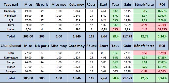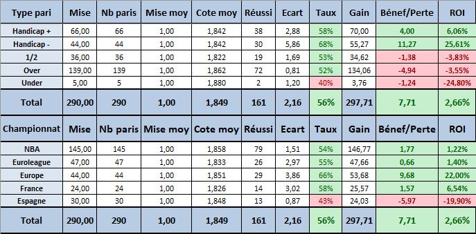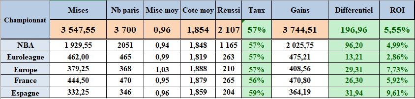 Pour interpréter les résultats, si votre unité de mise est par exemple de 100€, il faut multiplier les mises, les gains, et le différentiel par 100€.